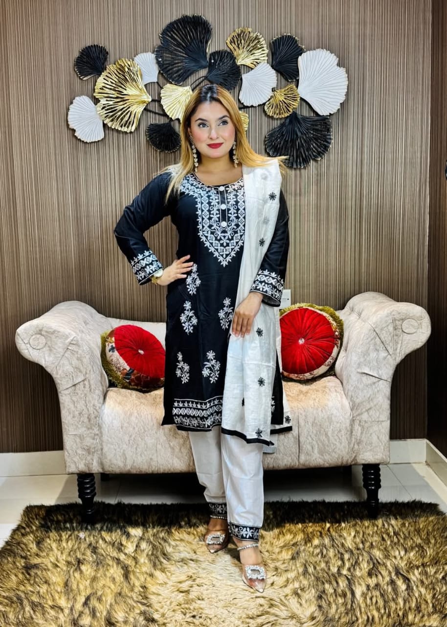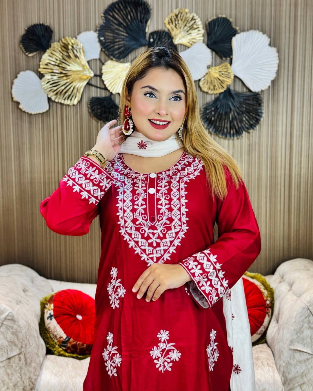 চিকেনকারি নেকলেস ডিজাইনের এমব্রয়ডারি কাজ করা থ্রি-পিস কালেকশন।।